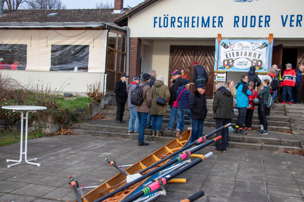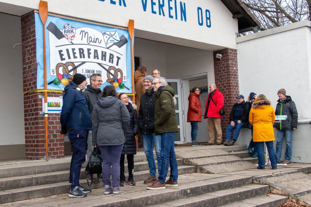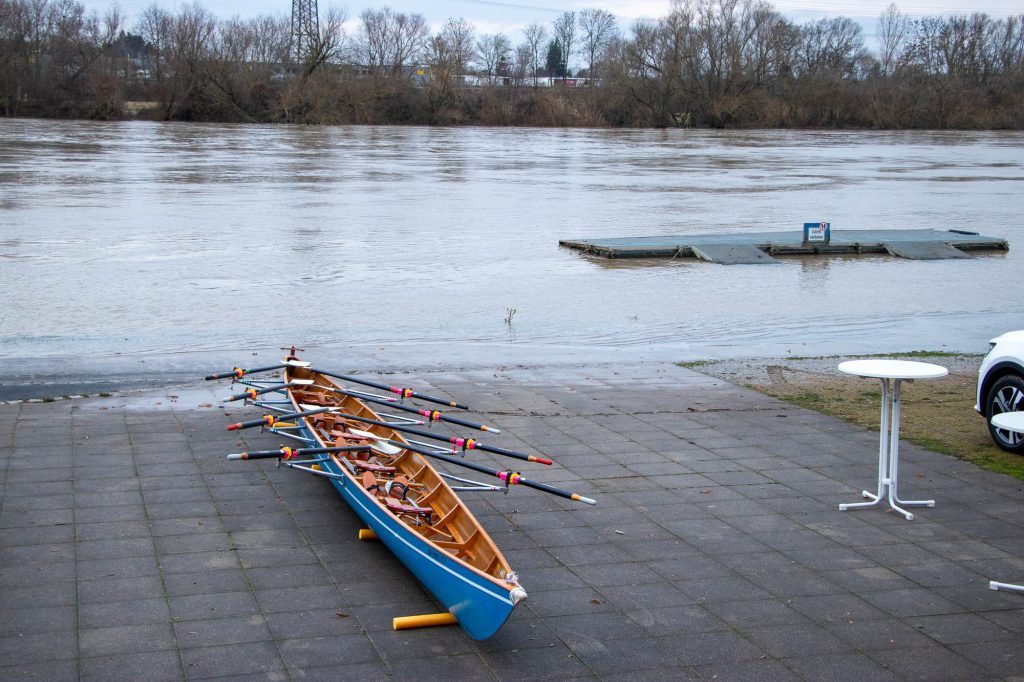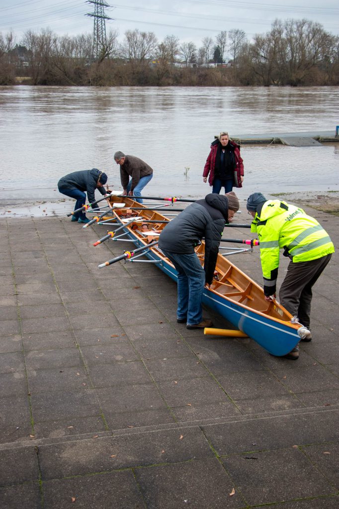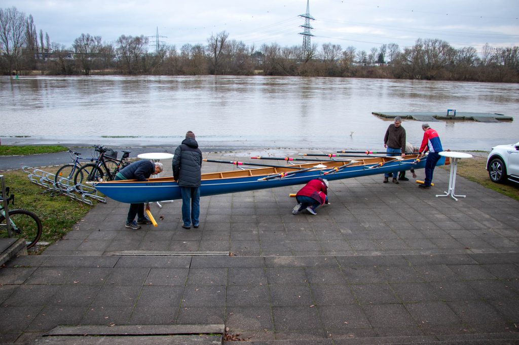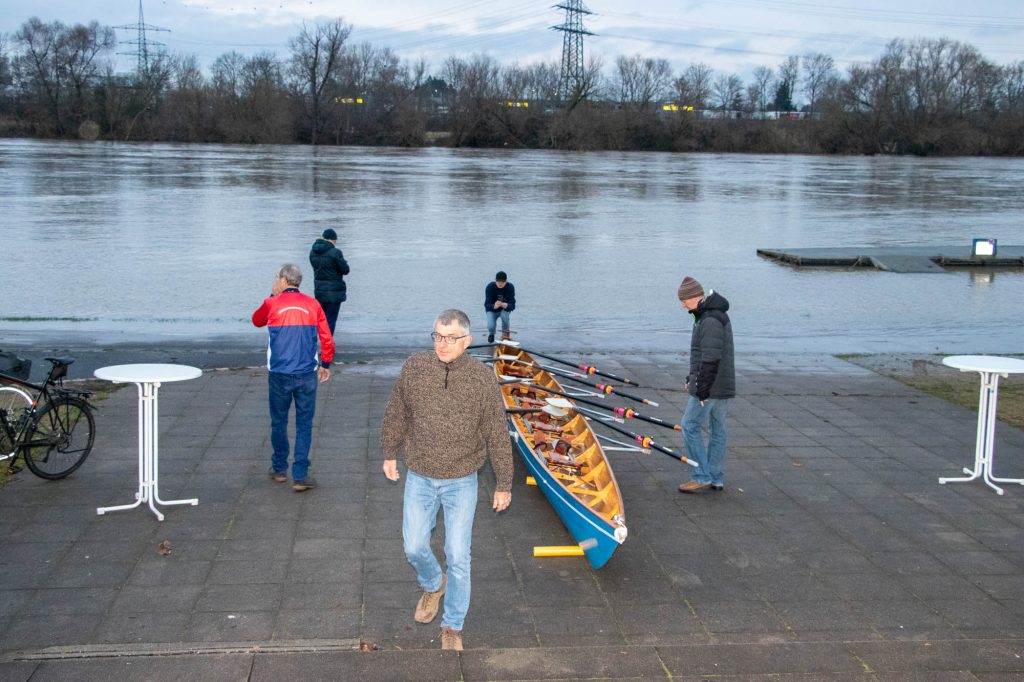 Beinahe stündlich prüfte das Organisationsteam die Prognosen der Pegelstände an Main und Rhein, um dann am 3.Januar final zu entscheiden: “das Bootshaus wird trocken bleiben, die Eierfahrt findet statt, aber wir werden die Gäste bitten, wegen der enormen Strömung auf eine Anfahrt im Boot zu verzichten. Zudem werden die Schleusen Eddersheim und Kostheim bis mindestens Sonntag gesperrt bleiben.