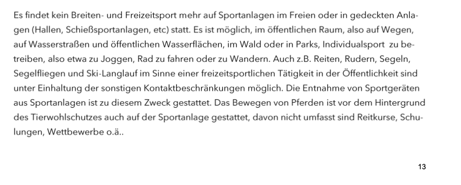Unten ist ein Auszug aus den Auslegungshinweise zur Verordnung zur Beschränkung sozialer Kontakte und des Betriebes von Einrichtungen und Angeboten aufgrund der Corona-Pandemie vom 03.11.2020 Seite 13 unter Punkt Sportbetrieb: