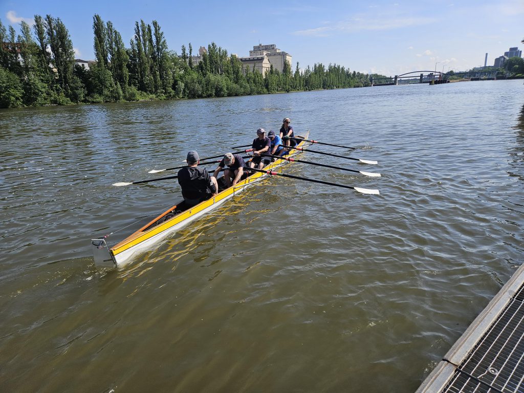Und so kam neben anderen die Idee, wenigstens den einen schönen Tag, Donnerstag, für einen Rudertag vom Frankfurter Ruderdorf nach Flörsheim zu nutzen. Schnell musste noch ein Mietbus mit Anhänger arrangiert werden, da unser Vereinsbus durch den Einbruch schlüssellos war. Ging dann auch und so starteten wir mit kleinerer Truppe und nur einem Boot bei strahlendem Wetter. Um 10:00 war das Team auf dem Wasser.