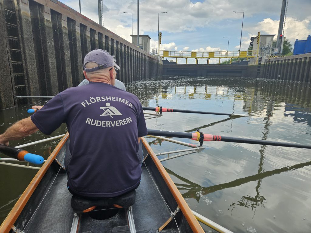 Schleuse Griesheim dauerte lange und 12:30 gab es Mittagspause neben der Nassovia Pritsche in Höchst mit Fahrerwechsel (Den Bus hatte Robert incl. Hänger nach Flörsheim zurückgebracht und kam dann mit dem Bus ohne Hänger zur Nassovia, er wollte natürlich auch noch im Boot fahren). Noch bei Sonnenschein passierten wir die „Farbwerke“ und warteten wieder 45 Min vor der Eddersheimer Schleuse bis wir hinter zwei Frachtschiffen in die Schleuse rudern konnten.