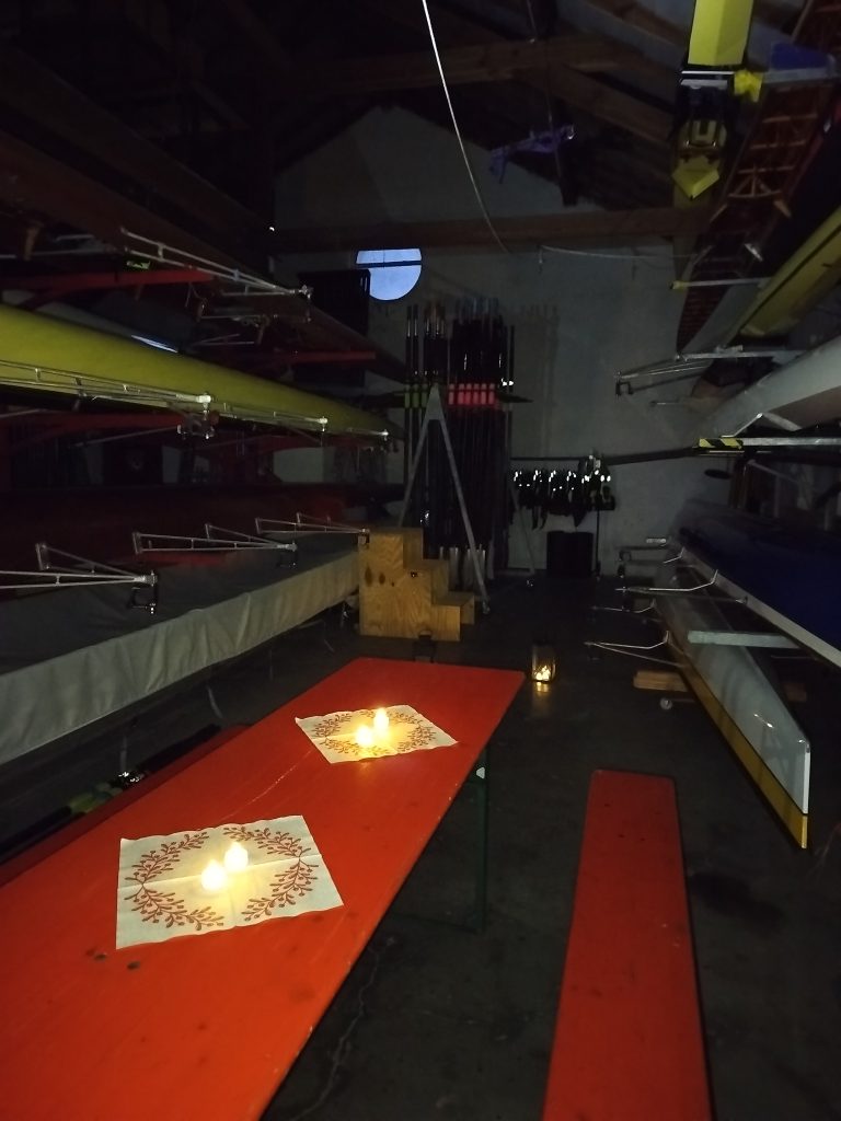 Wir hatten uns zwar etwas mehr Besucher erhofft, aber gerade die wenigen Besucher machten den Abend ruhig, persönlich und sehr stimmungsvoll. In kleiner Runde und ganz deshalb auch ganz besonderer Atmosphäre fand unsere adventliche Veranstaltung unter dem Motto „Mit allen Sinnen genießen“ in der Bootshalle statt, die Robert davor stimmungsvoll geschmückt hatte.